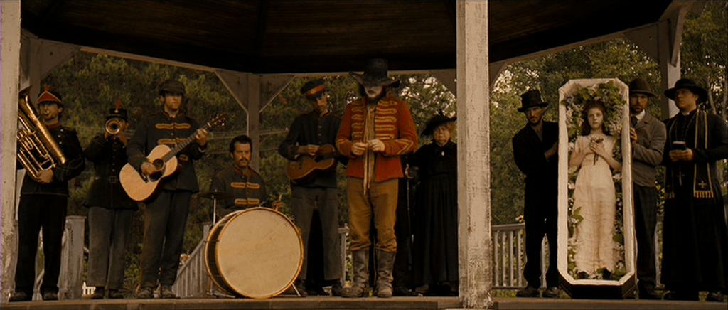 Jim James is singing at the wake of a young lady as a crowd gathers to listen to this obscure tale. His face is painted white as a nod to Dylan’s makeup effect from Renaldo and Clara. The subject matter of the lyrics have always seemed suspect to me. I have always felt that they have a very adult connotation to them, especially in the mischievous way Dylan delivers them. But as so often they can be transformed by a new interpretation – and in this case by the visuals given through a film maker. Will have to leave the images for this song to you, mine having been tainted by the movie, which is in itself not a bad thing. Calexico keeps the slow moody pace of the original yet substitutes the swirling carnival like keyboard sound of Garth Hudson with acoustic guitars and Robbie Robertson‘s guitar interludes with a brass section reminiscent of early 70ies r&b songs. You could write a dissertation on this one scene alone if you were to try to analyze all the bizarre characters and their references gathered in the audience.